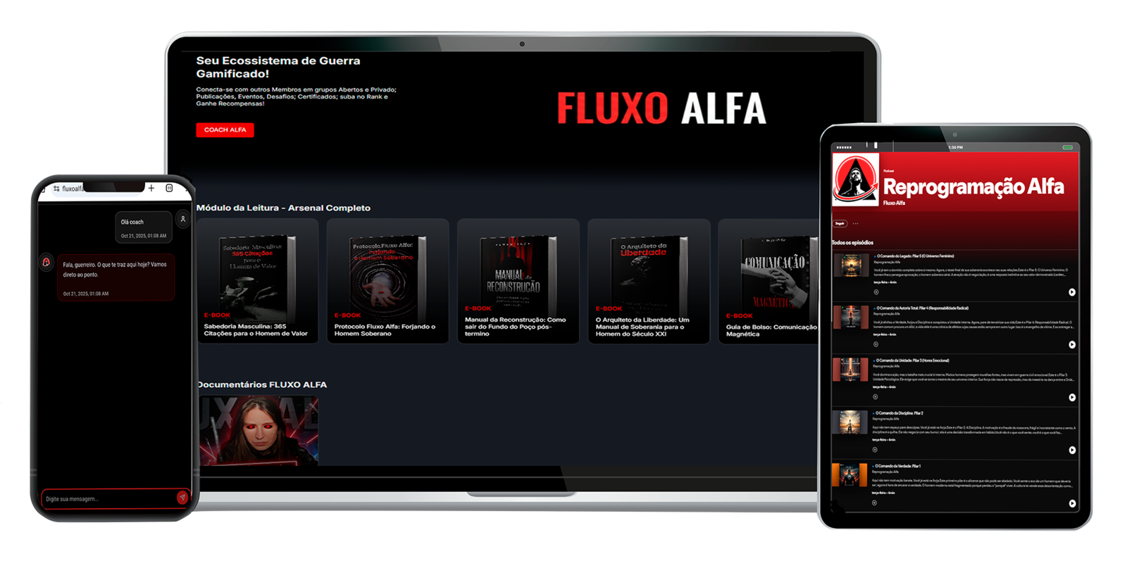 PARA TODO HOMEM QUE BUSCA SOBERANIA. A guerra interna é a mesma. As táticas se aplicam. Seja em crise conjugal, na busca por uma parceira de valor, ou reerguendo-se de um término, o Fluxo Alfa oferece as ferramentas para você comandar sua vida, seus relacionamentos e suas emoções, independente do seu estado civil.